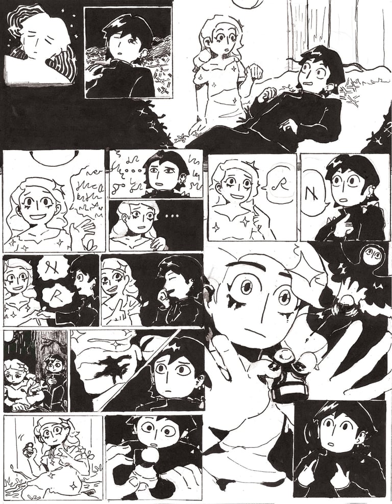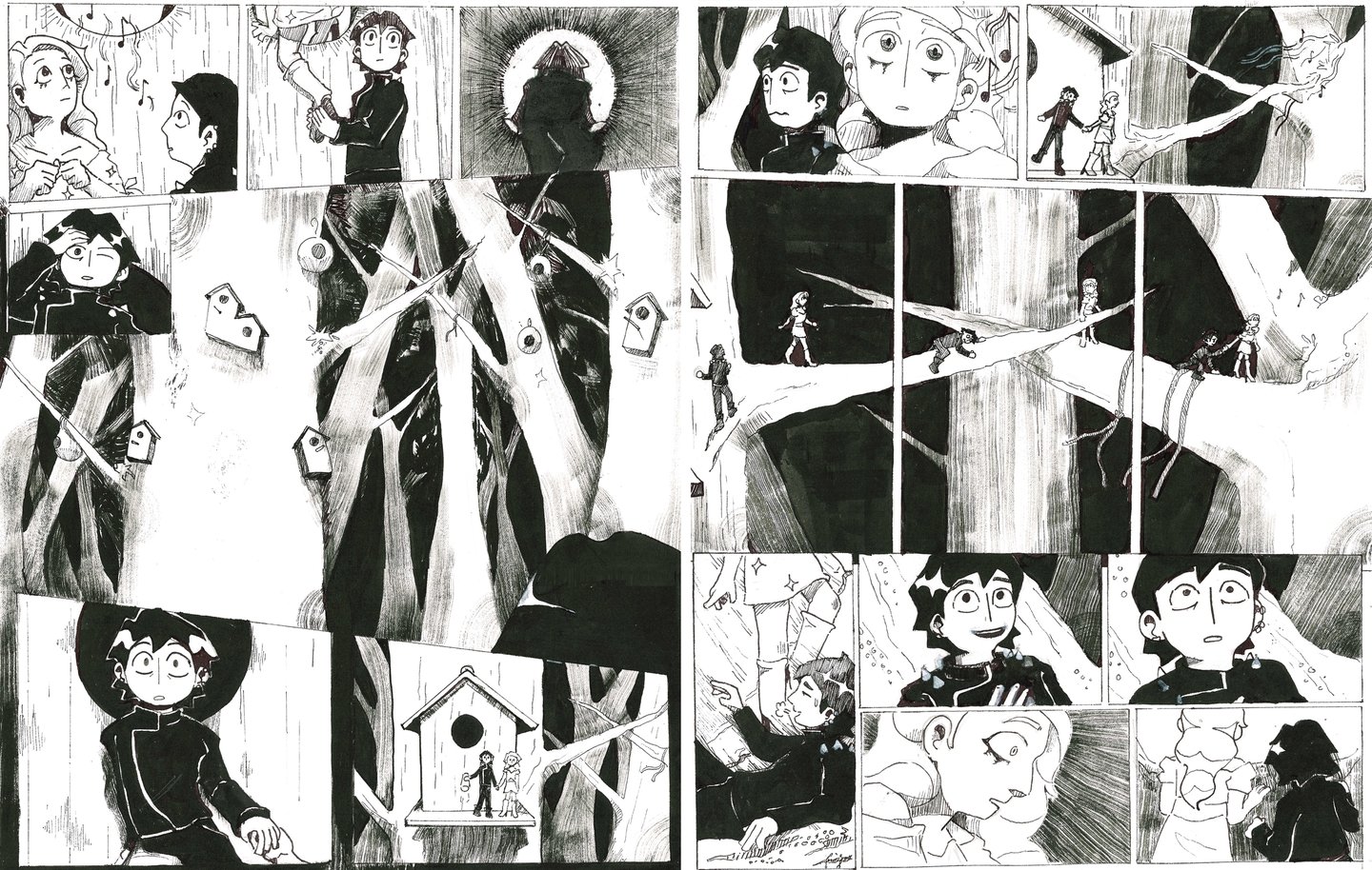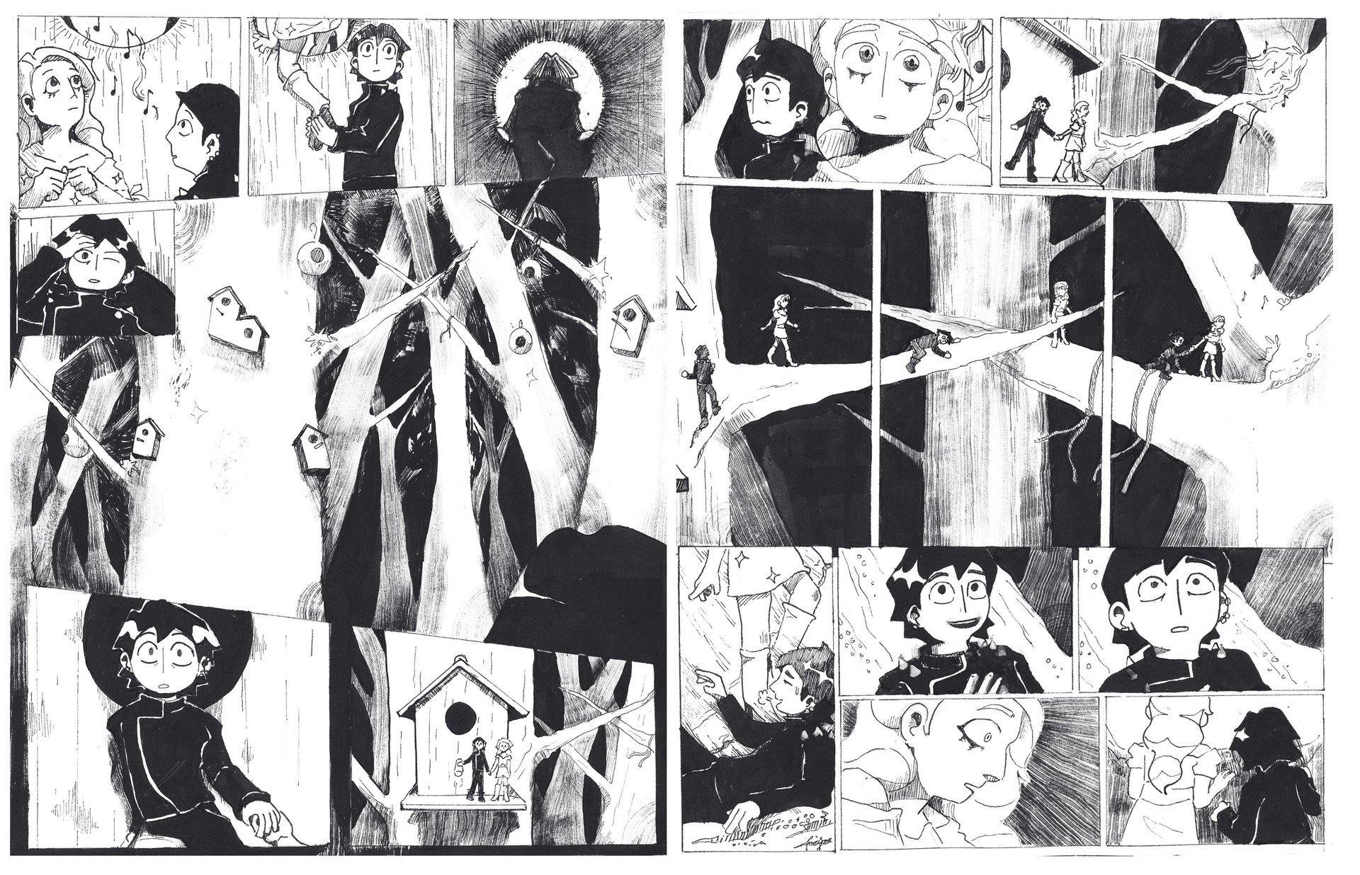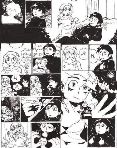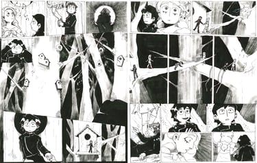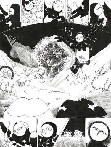 The Obsessive Collector is a wordless black and white comic I created in 2024 for a university brief. Each page is about A3 in size and fully hand-inked. The story follows two women, who a bird-like entity has abducted to a strange dimension.
