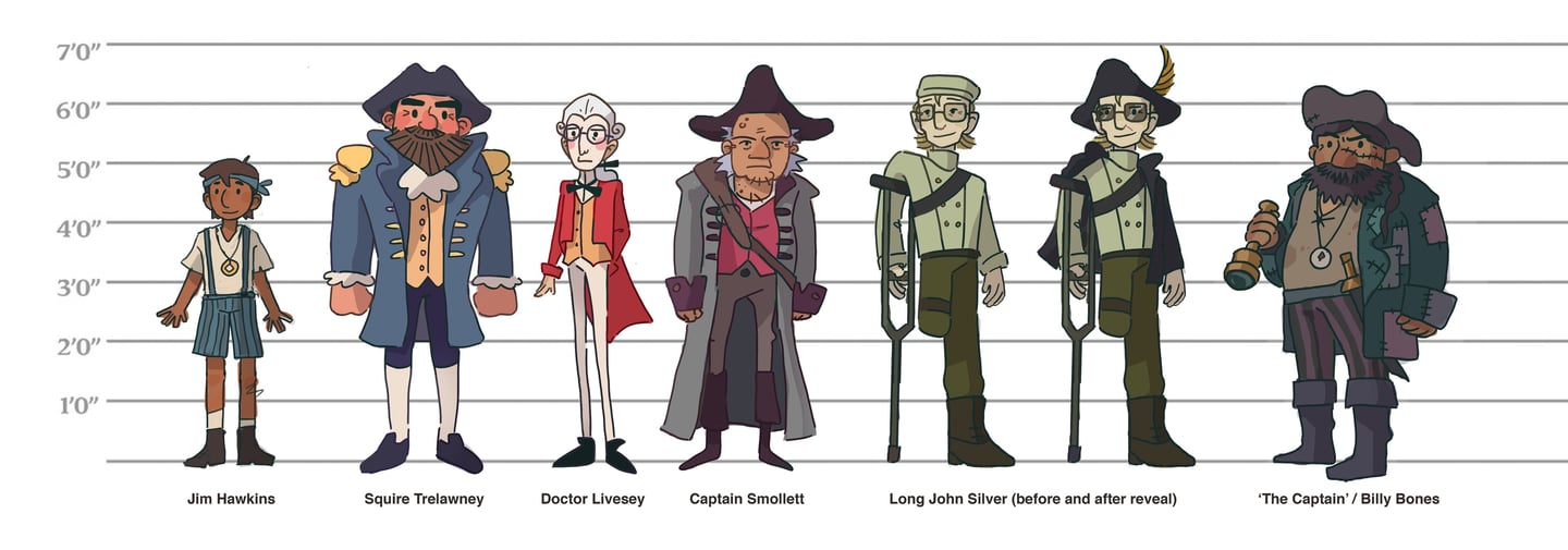 While designing these characters, I aimed to make their personalities readable in an instant, from Jim's adventurous spirit to Trelawney's cheer and strength, to Livesey's more serious and nervous disposition.